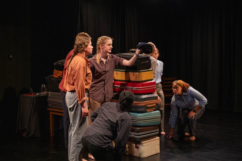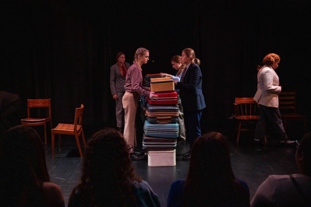 Then, the music shifted, so did the lights. The stage became darker, the music moodier. The groups built the wall using their suitcases. They made eye contact with each other as they moved furniture in Hamilton-esque fashion- slowly and with purpose, above their heads or below their chests, in tune with the music. Yurkovskaya’s directing and sound design shines through here as the show begins its’ slow departure from realism.