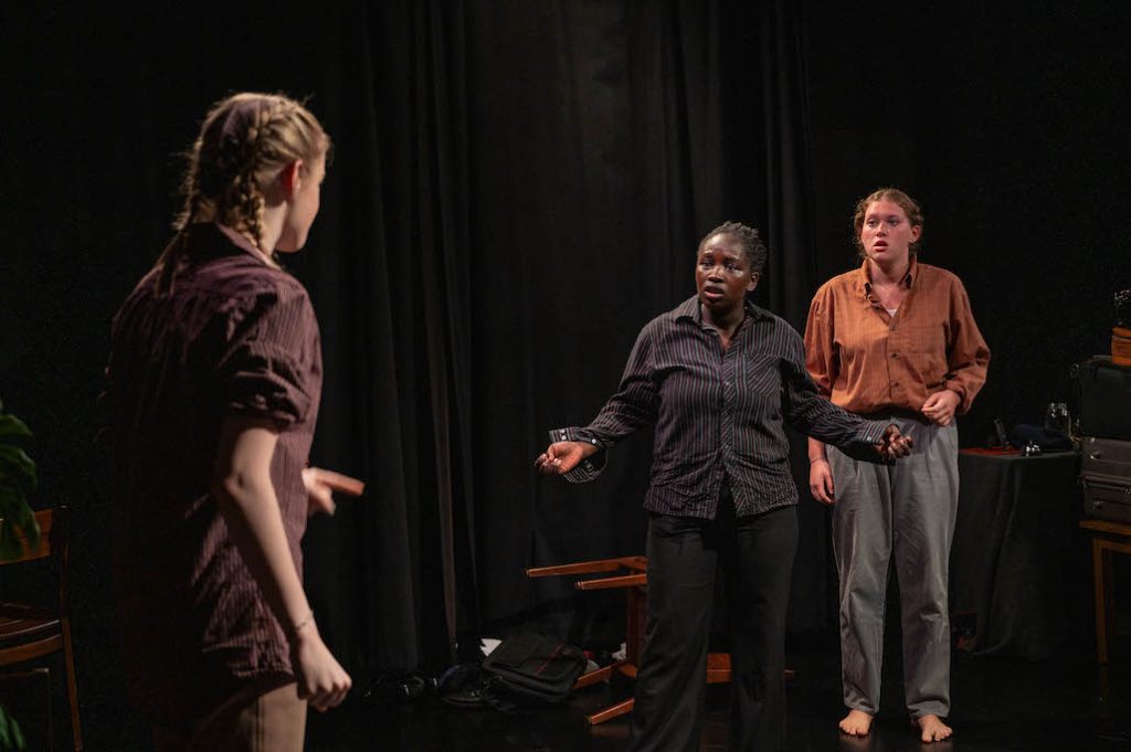 Directed by Katya Yurkovskaya ’26, Us and Them is about two groups of people who ultimately decide to live on the same plot of land. The show is a commentary on sharing— can they do it? Will they do it successfully? The Recorder, i.e the well-dressed concierge, left the question answered with non-answers about human nature. She scribbled away in her notebook as two groups filed into the hotel carrying many suitcases.