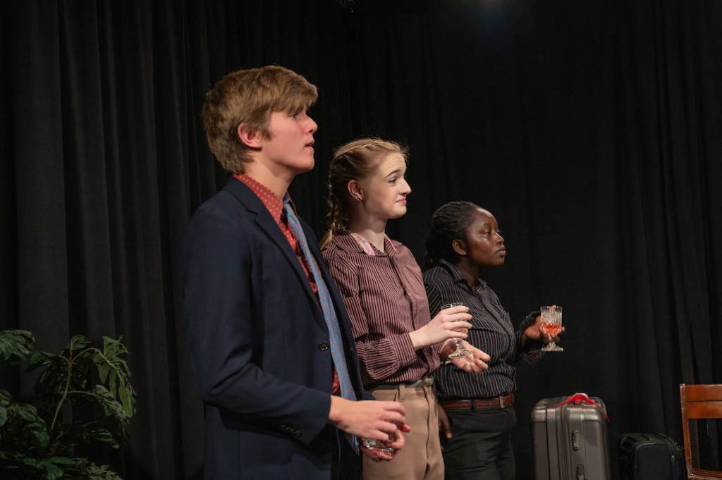 On October 7th and 8th, walking into Studio A in the Janet Kinghorn Bernhard theater meant walking into a classy hotel lobby. Warm brown furniture scattered about the space, a concierge table in the back, big leafy potted plants by the doors. Soft piano music played in the background as you walked in and were greeted by a well-dressed concierge. Said well-dressed concierge, played by Becca Durst ’27, frantically cleaned miscellaneous items from the floor, including but not limited to two decks of cards— one red, one blue, cleaning supplies, rope, a broken clock, a concierge’s bell, a framed photo, and a bottle of alcohol. A messy sight, further added to by Durst’s frantic interactions with the audience. One can’t help but think that this concierge is falling apart at the seams. This is how Us and Them by David Campton begins.