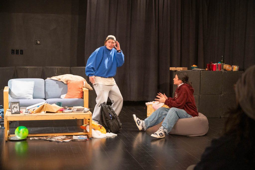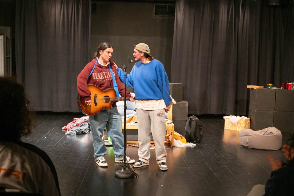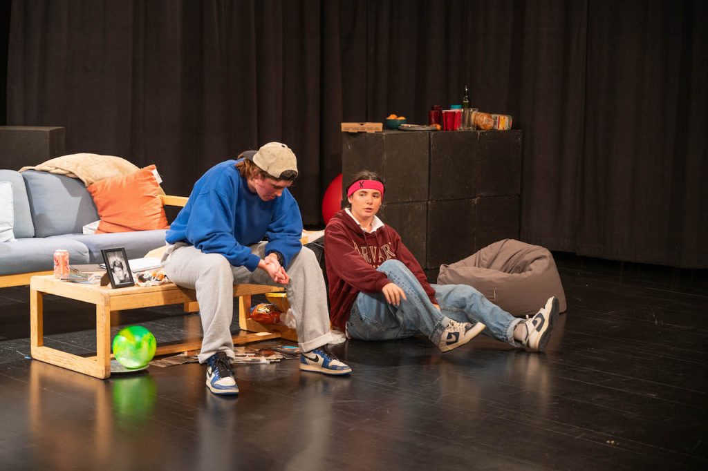 While I could spend the rest of this article gushing over the scenic design, my editor is probably expecting me to talk about the actual story. In Matt & Ben, we are introduced to our two main characters, the famous actors and screenwriters Matt Damon (Caroline Zaikowski ’29) & Ben Affleck (Willow Forbes ’26), pre-fame, who are gifted with a script of the movie that will turn them into A-listers, Good Will Hunting. Ben is all but eager for them to use the script for their own gain, but Matt is more skeptical of the idea of using a script that they themselves didn’t actually write. This is where the central conflict of the story arises. Underneath the tropes common in most slacker comedies, there is a deep philosophical debate over integrity, success, privilege, and friendship. As the debate between Matt and Ben continues, we learn more and more about their shared past, including that they both entered a talent show together, the fact that Ben slept with Matt’s prom date, or them practicing eye contact for a scene for class, all of which helps to reinforce what we know about the characters, with Ben presenting as unserious, confident, and distant, while Matt is more open, anxious, and stubborn.